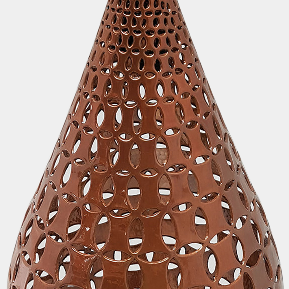With its natural colour, this copper lampshade is absolutely stunning. We fell in love with the light feel of its open geometric pattern. Each shade is made by hand with unique character. Electrical fitting not included.