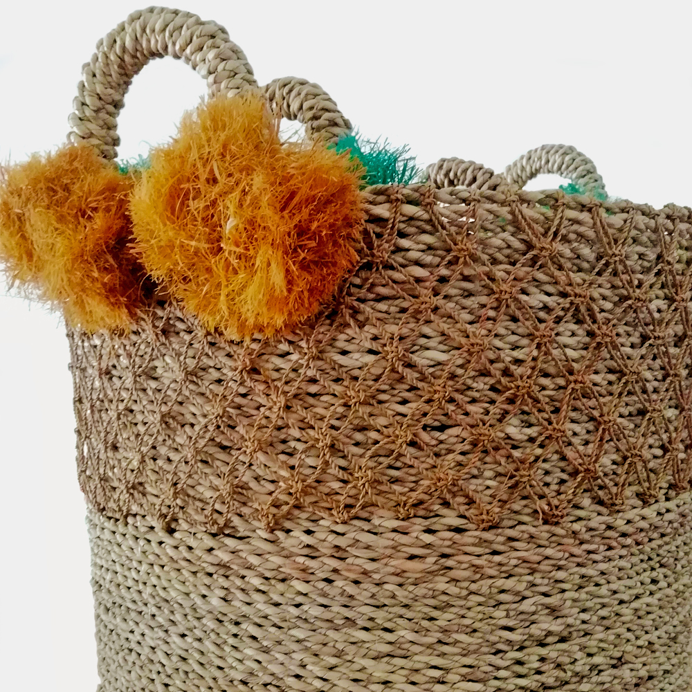 Handmade by our local craftsmen, our set of 2 Pineapple baskets are made from twisted natural rattan, finished with a detail created by circular weaving of pandan. Finished with pompoms of orange and green, this is a functional yet beautiful set of baskets.