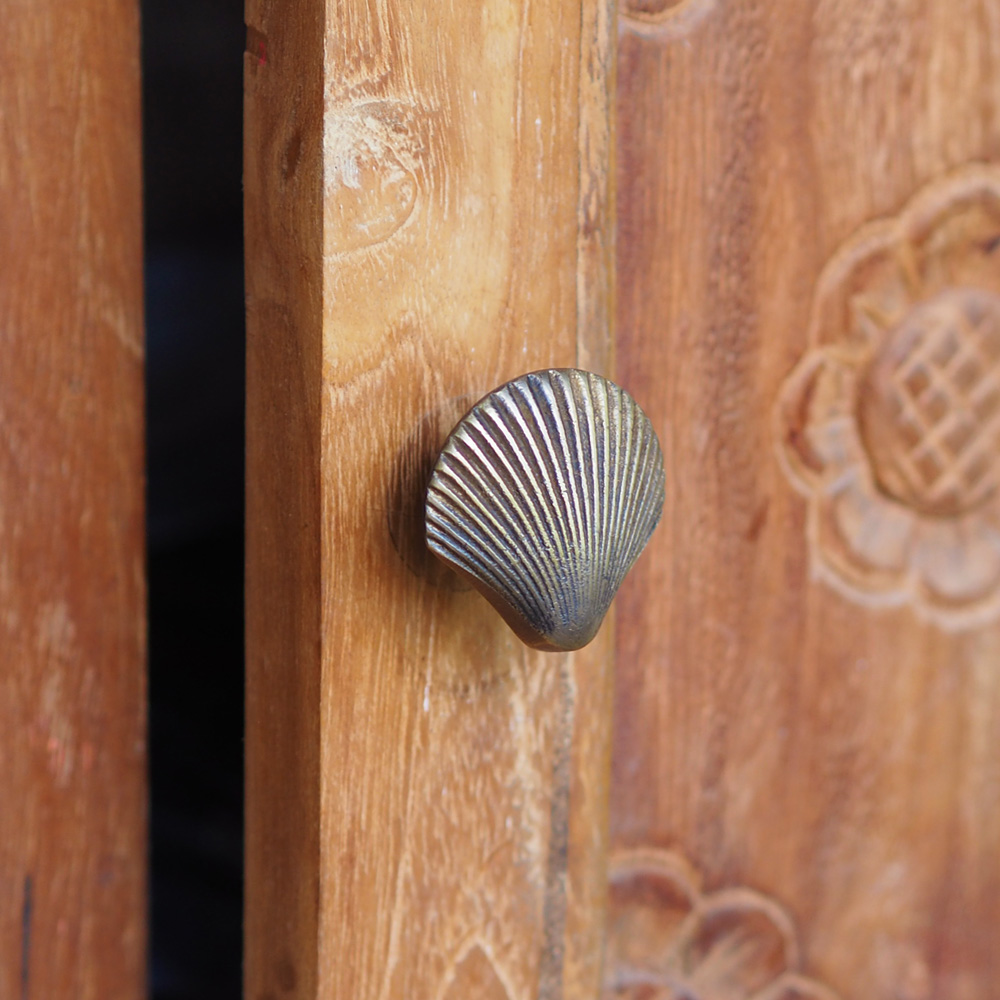 Hand-forged high-quality brass handle in detailed seashell shape, handmade by local artisans in Bali. The master craftsman descends from generations of gold and silversmiths in Indonesia. Easily attached to any cabinet with the included fitting bolt.