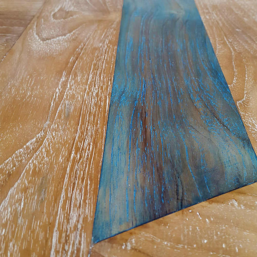 We love furniture that with a simple twist makes a huge statement. Lake is a rectangular whitewashed teak dining table, featuring a geometric patterned top created with blue and red washed inlays.