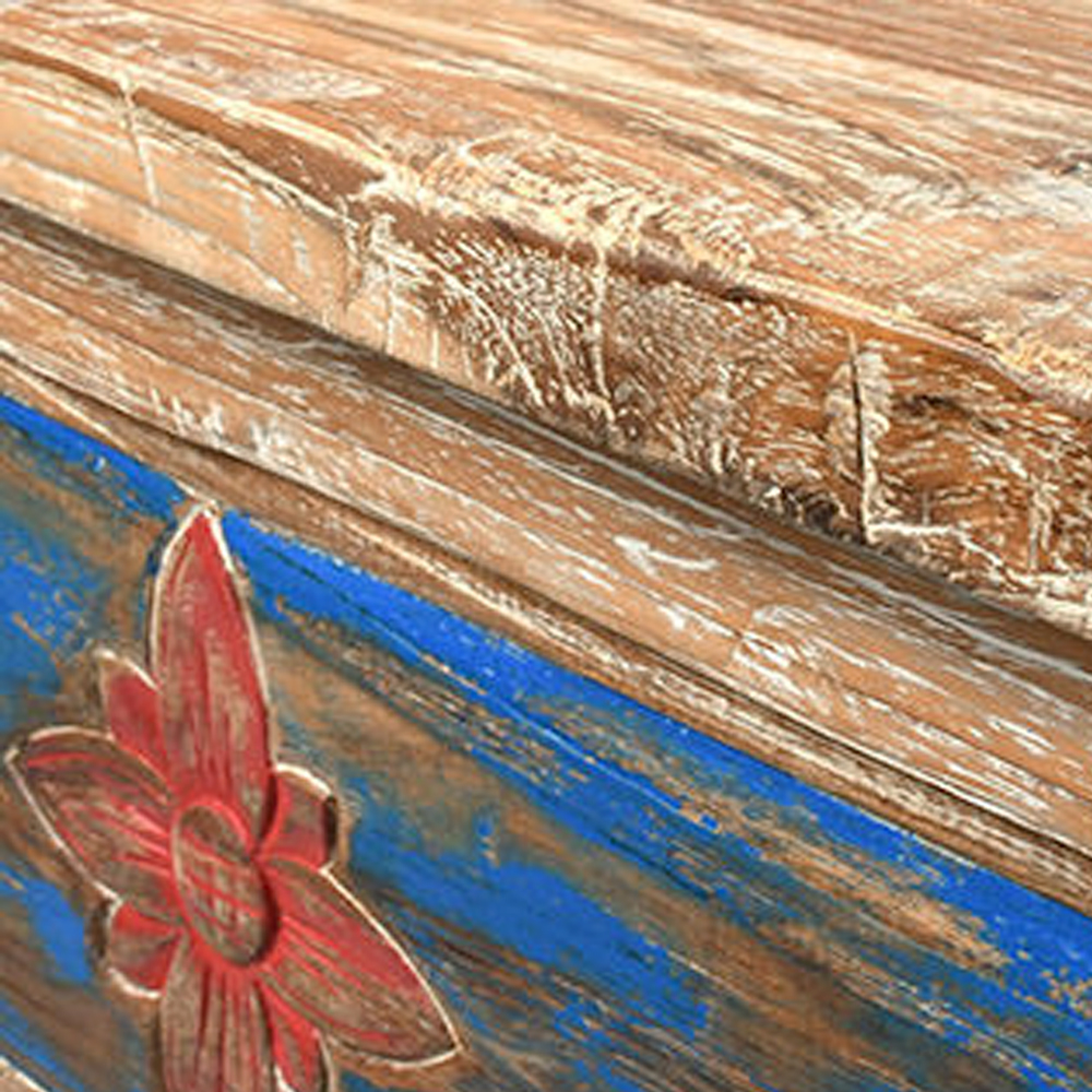 This long teak coffee table will add a splash of vintage colour into your living room. Our artisans lovingly paint by hand and distress the carved detailing around the sides.