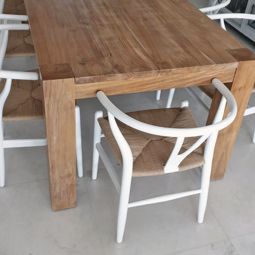 Our wish is an island take on a classic designer dining chair. Hand-crafted curves in solid teak are given a fresh white coat and finished with a comfortable and locally sourced mendong seagrass woven seat.